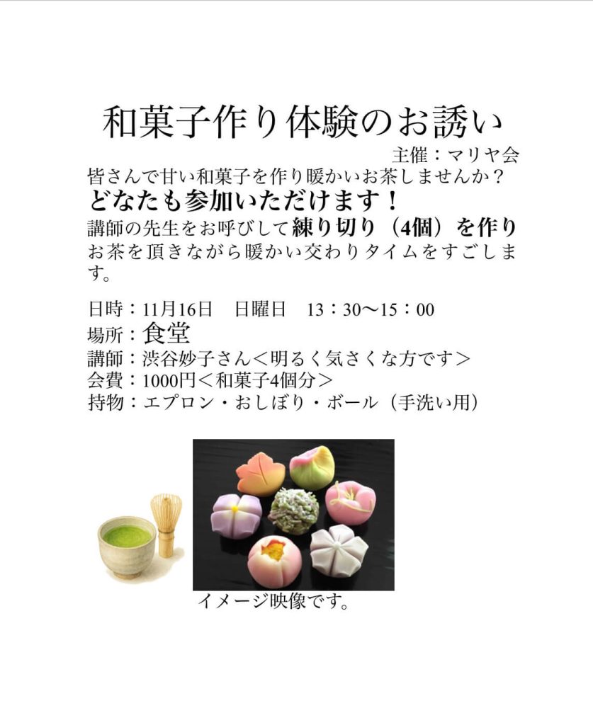 11/16 和菓子作り体験 イベント 2025.11.17 日時:11月16日 日曜日 13 30~15:00 場所:食堂 講師:渋谷妙子さん<明るく気さくな方です> 会費:1000円<和菓子4個分> 持物:エプロン・おしぼり・ボール (手洗い用)