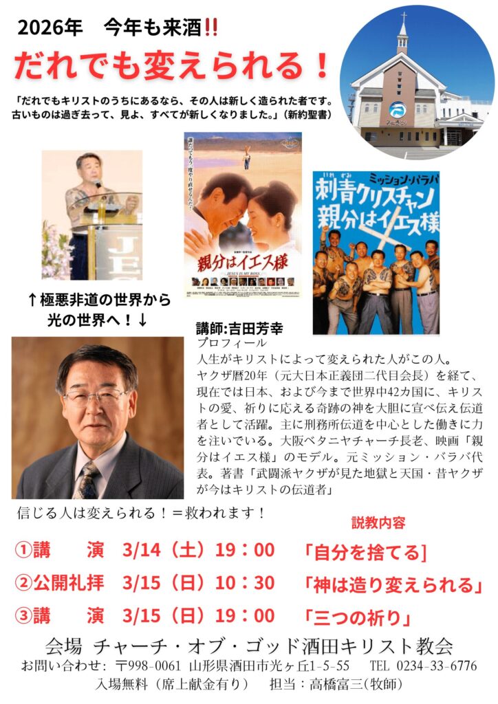 3/14-16 吉田長老による特別伝道集会/礼拝 イベント 2026.02.25 恒例集会であります、大阪ベタニアチャーチより吉田芳幸長老が来酒されます!(集会は14日夜7時〜、礼拝は15日朝10時半〜、夕拝は15日夜7時〜です)。「さが・すく」で祈ってこられたご友人・知人をお誘いする機会としてお用いください!
