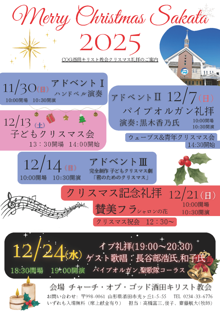 | 12/24(水) | 開場 18:30 / 開演 19:00(~20:30) | クリスマスイブ礼拝 | ゲスト歌唱:長谷部浩氏・和子氏・キャンドルサービス聖歌隊 |